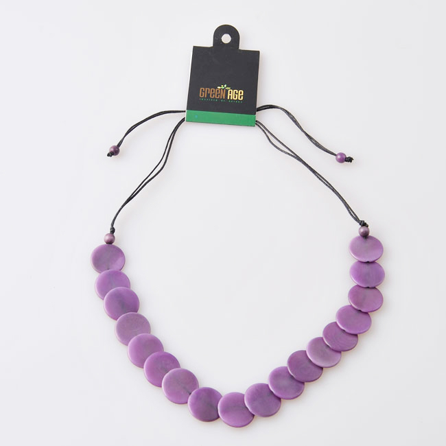 Kette Magi II in lila von Green Age mit hocheleganten dünnen Tagua Scheiben, die sich perfekt um den Hals legen. Das gewachste Baumwollhalsband ist sehr reißfest und kann per Ziehverschluss individuell eingestellt werden. Maximale Länge 30 cm.