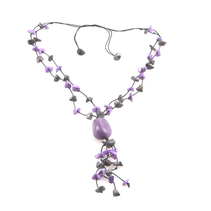 Tagua Kette Zarai long purple grau von Green Age. Das gewachste Baumwollhalsband ist sehr reißfest und kann per Ziehverschluss individuell eingestellt werden. 40 cm lang